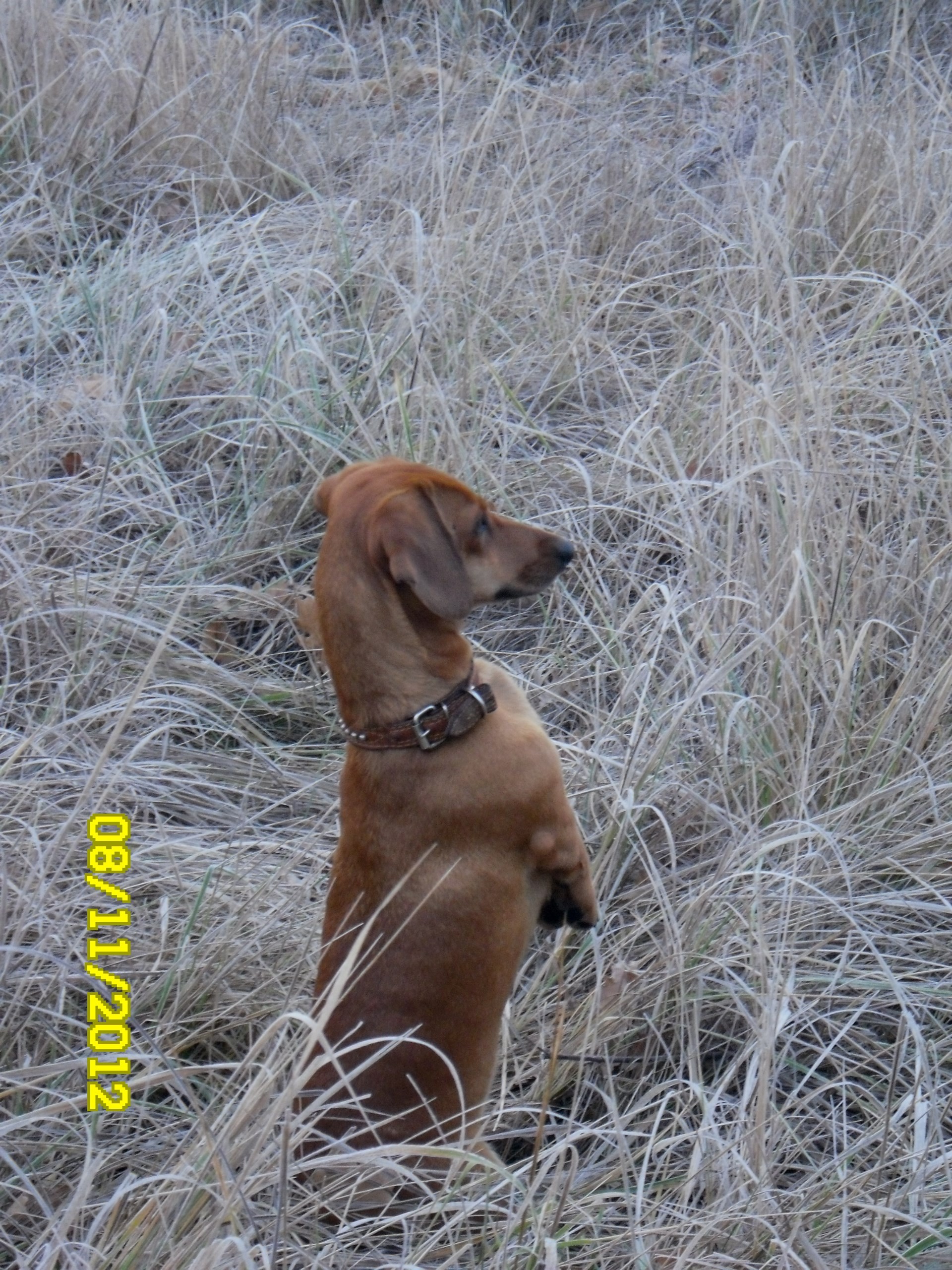 Un piccolo bassotto fa capolino da dietro l erba