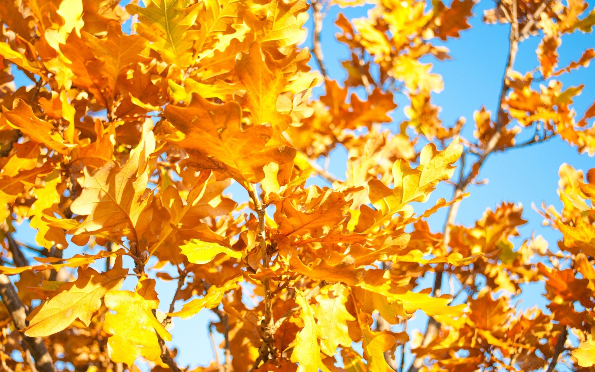 Foglie di albero giallo brillante su uno sfondo di cielo blu