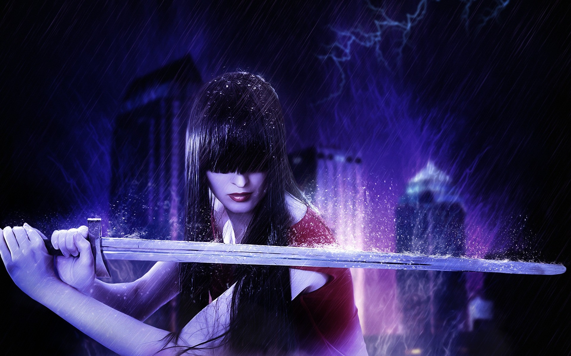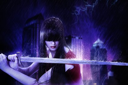 Incredibile ragazza che tiene una spada su un bellissimo sfondo
