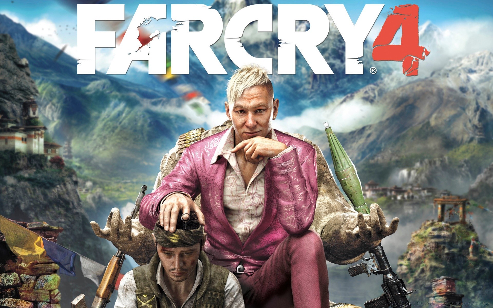 L'eroe del gioco Farcry 4 in un abito rosa, con un servo e un'arma sullo sfondo di un paesaggio montano