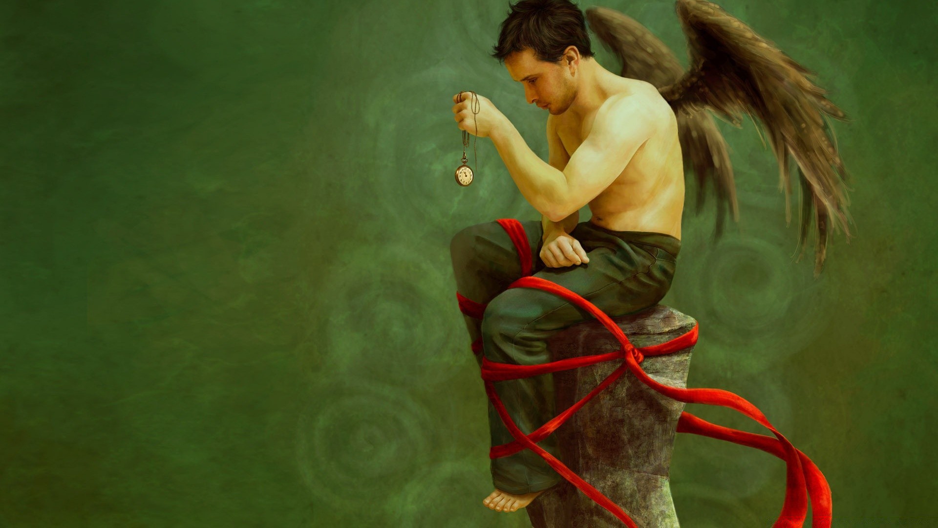 Angelo con le ali scure tiene in mano un orologio d'epoca