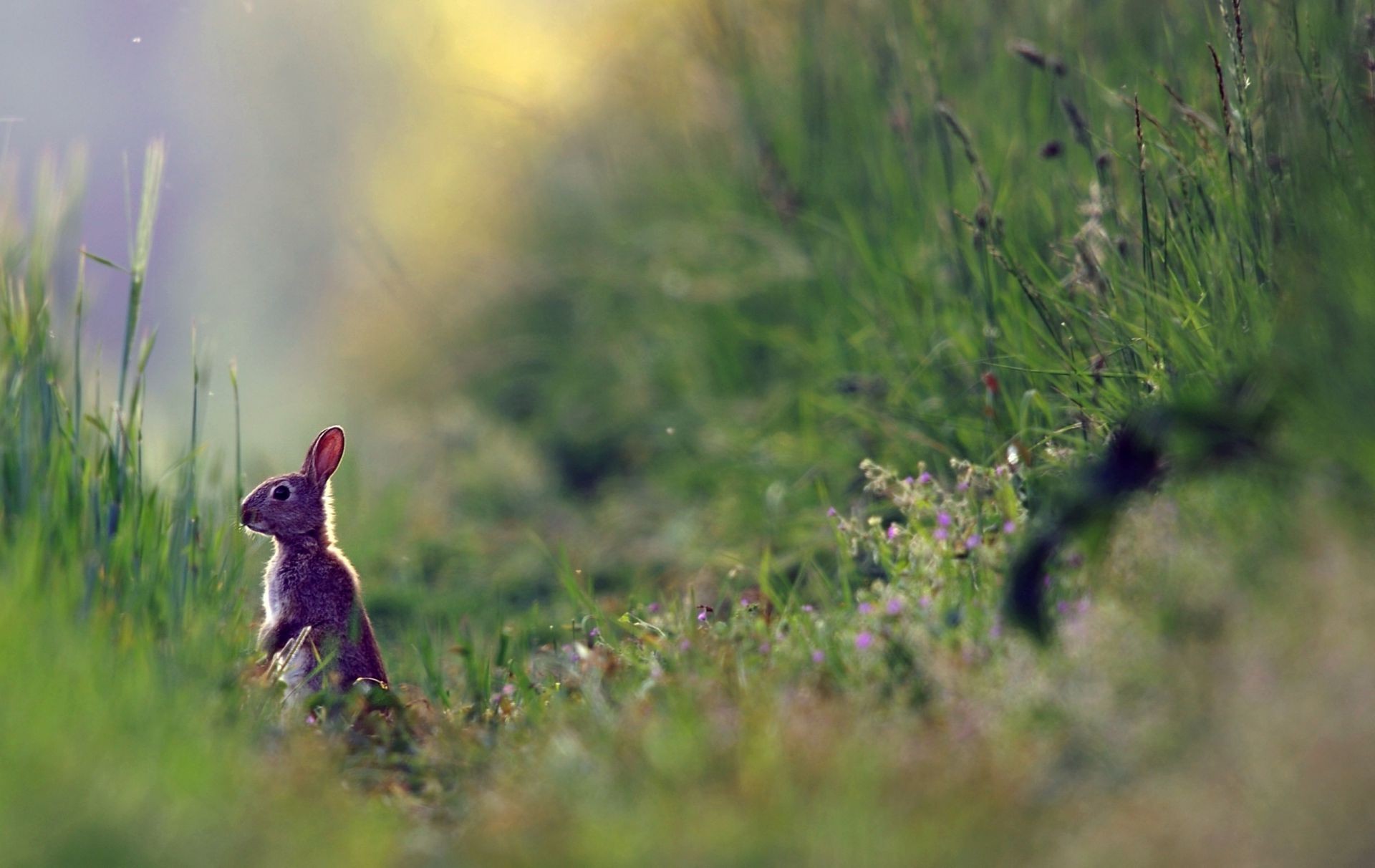 Nell'erba sulle zampe posteriori c'è una lepre e guarda attentamenteNell'erba sulle zampe posteriori c'è una lepre e guarda attentamente