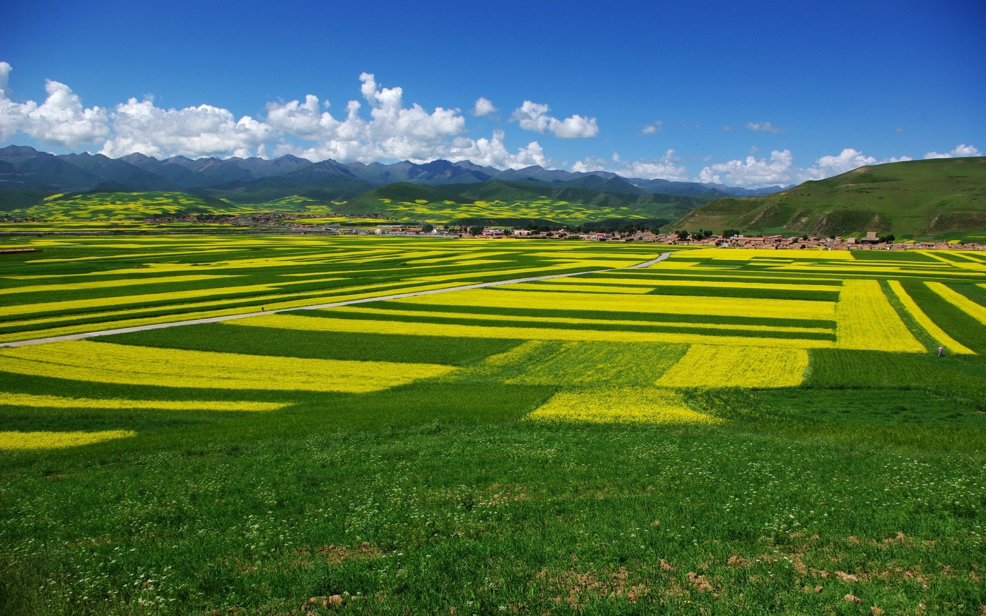 Mondo naturale. Campo con fiori sullo sfondo delle montagne