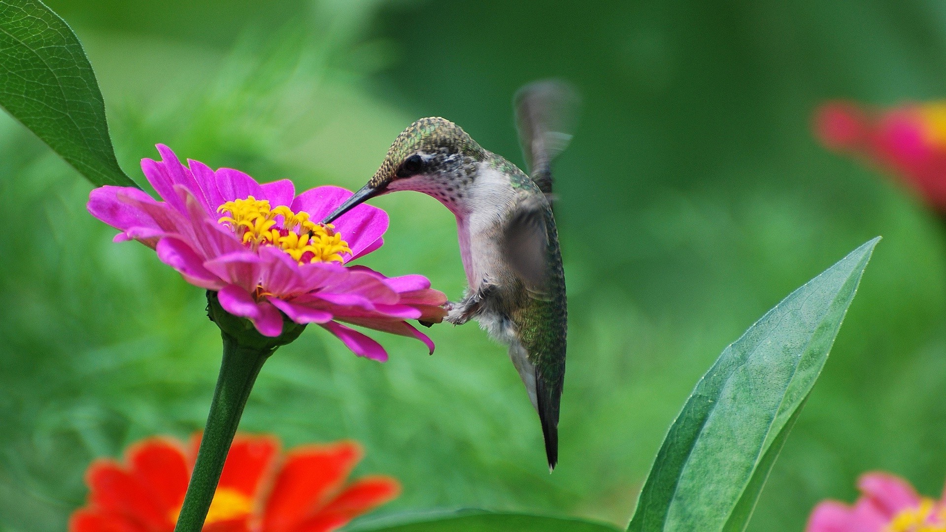 Un piccolo colibrì raccoglie il nettare da un fiore rosa