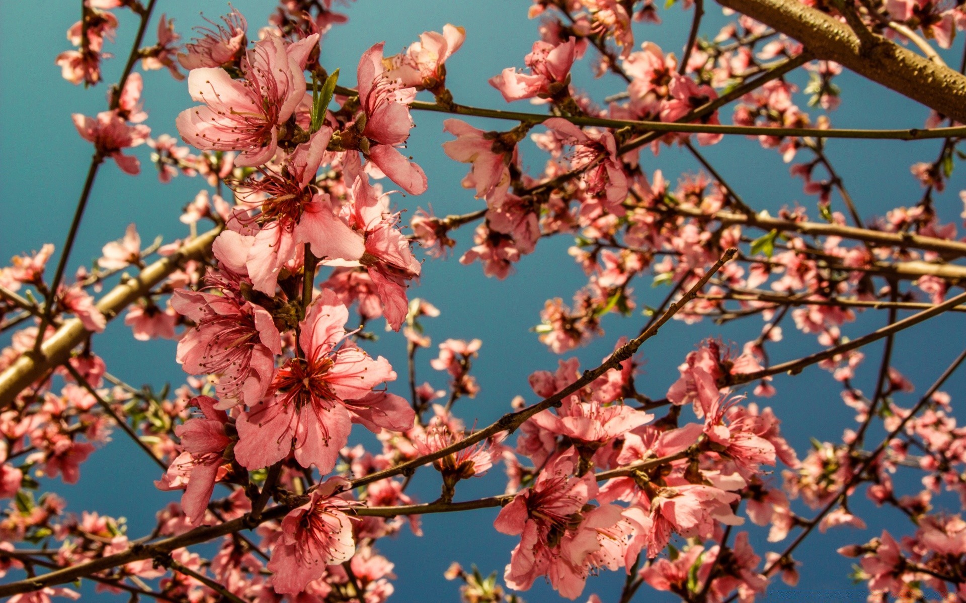 Ramo di fiori di ciliegio su sfondo blu