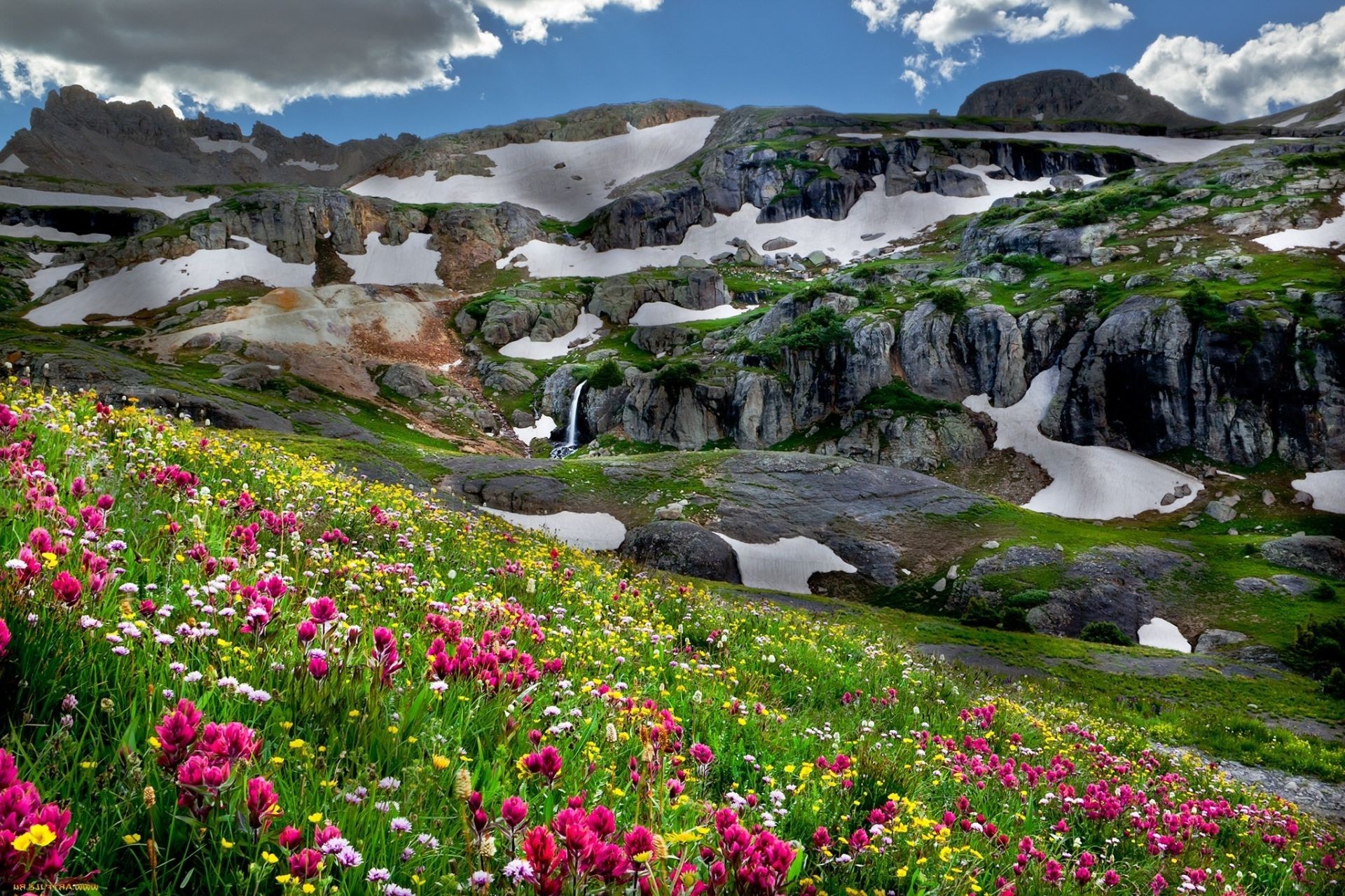 Fiori di montagna luminosi sotto un cielo nuvoloso