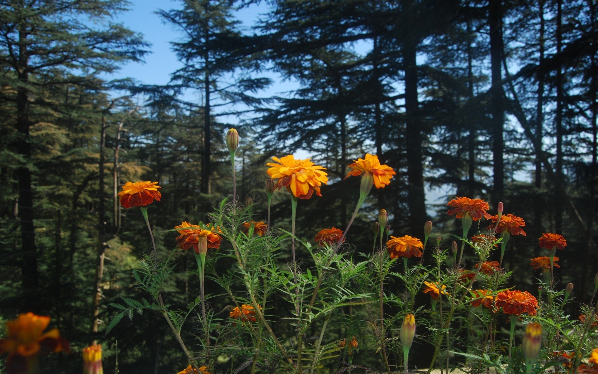 Fiori d'arancio su uno sfondo di alberi di Natale