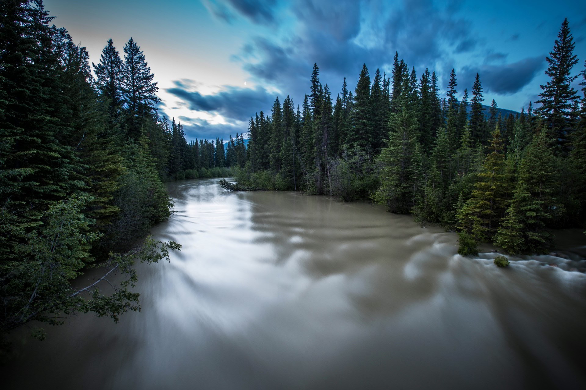 Un fiume di acqua torbida nel mezzo di una foresta di abeti verdi