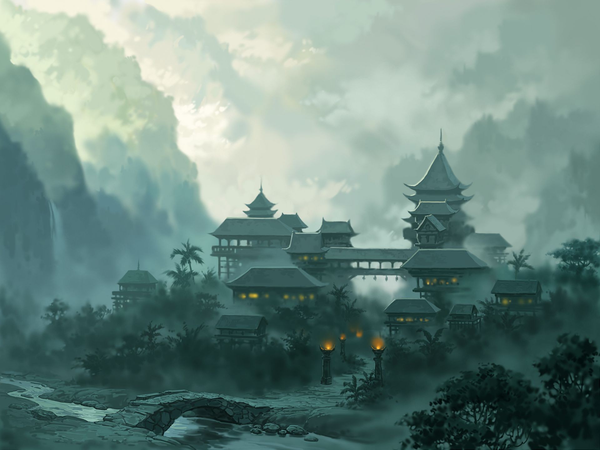 Jade dynasty fiume paesaggio nebbia città montagna ponte luci