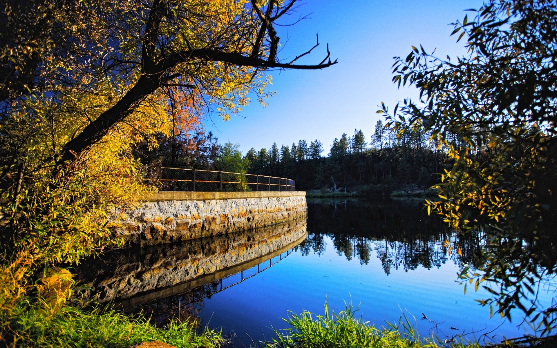 Inverno soleggiato. Brina bianca sugli alberi. Fiume congelato