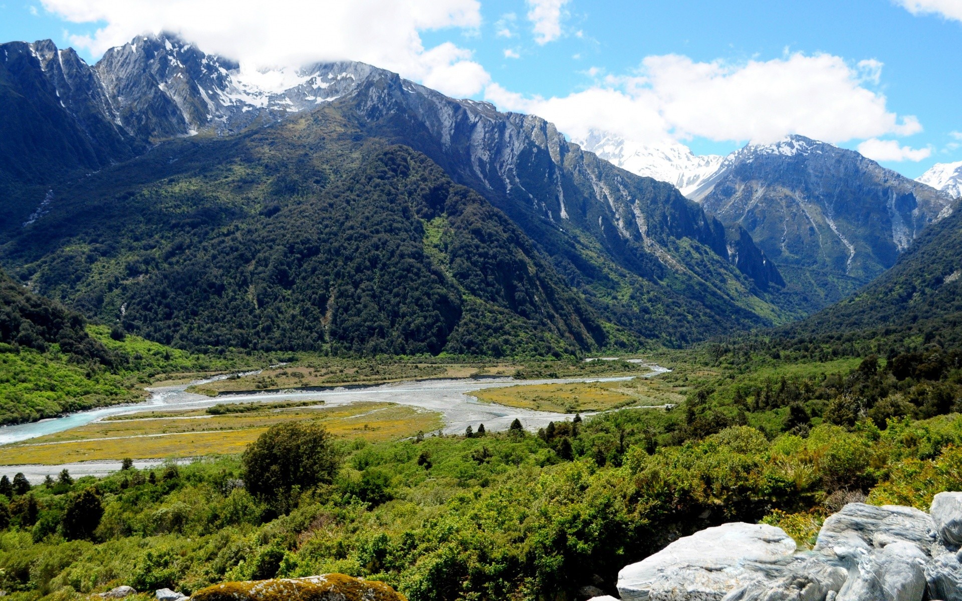 Immagine del delta del fiume di curva nel mezzo della foresta verde e delle montagne