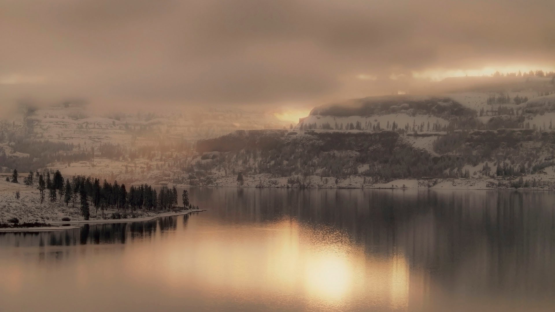 La montagna è snella dal fiume e intorno alberi e cespugli
