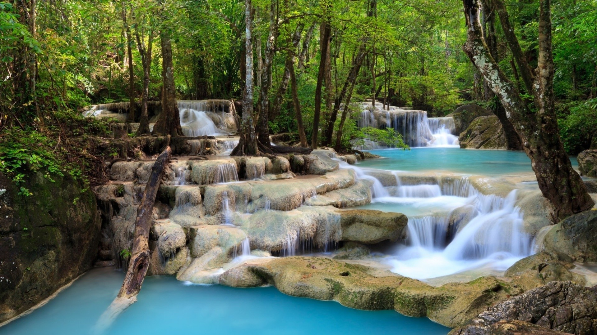 Cascata nella foresta pluviale e rocce ricoperte di muschio