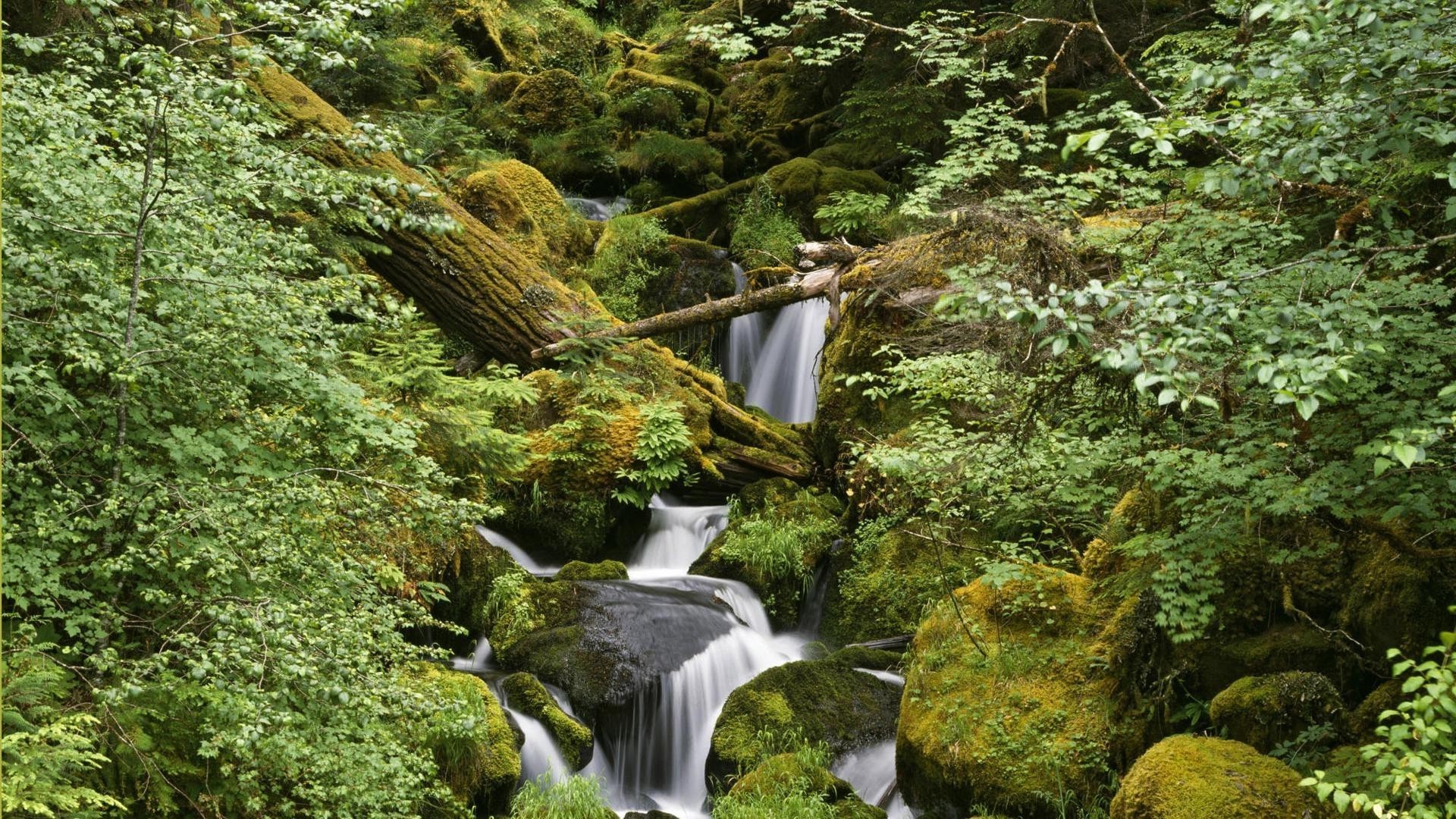Cascata sullo sfondo di montagne, arcobaleno e alberi verdi