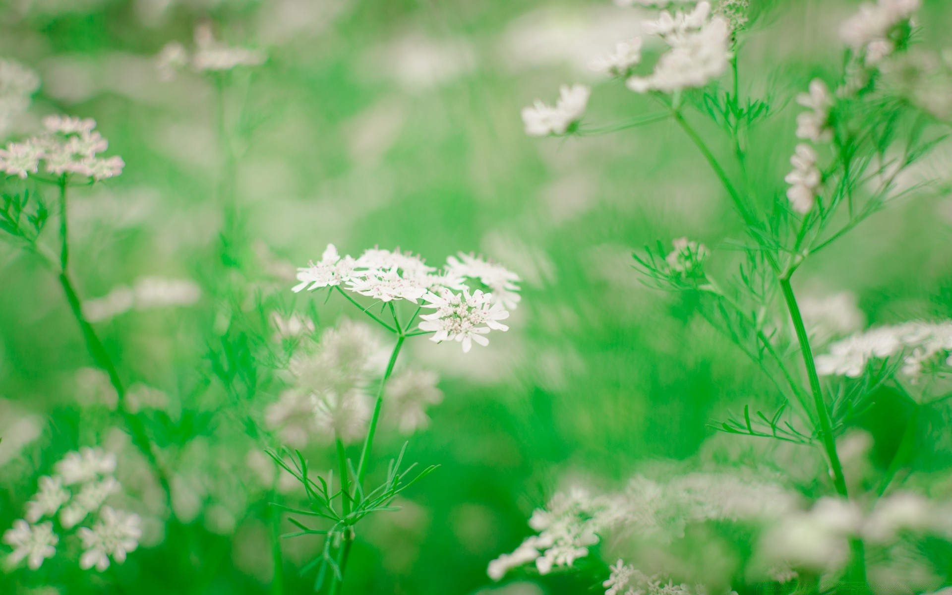 Fiori bianchi con cinque petali Tre Fiori in primo piano sfondo sfocato sullo sfondo cielo blu con nuvole