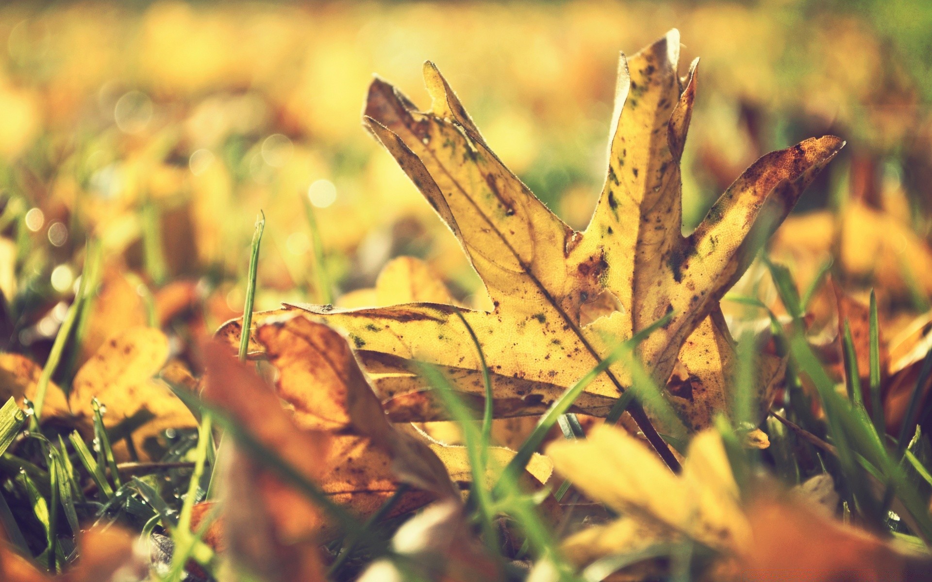 Ragazza in abito luminoso su un tappeto di foglie arancioni nella foresta
