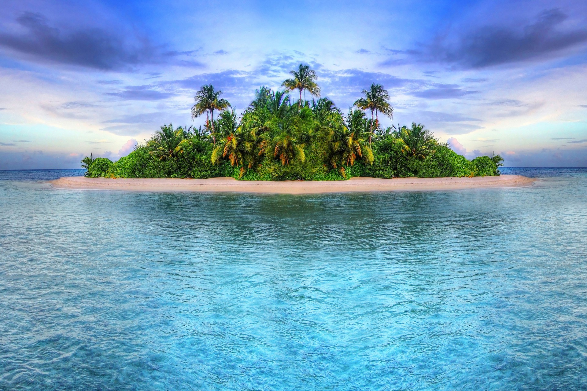 Isola tropicale in mezzo all'oceano, molta acqua e pesci nuotanoIsola tropicale in mezzo all'oceano, molta acqua e pesci nuotano