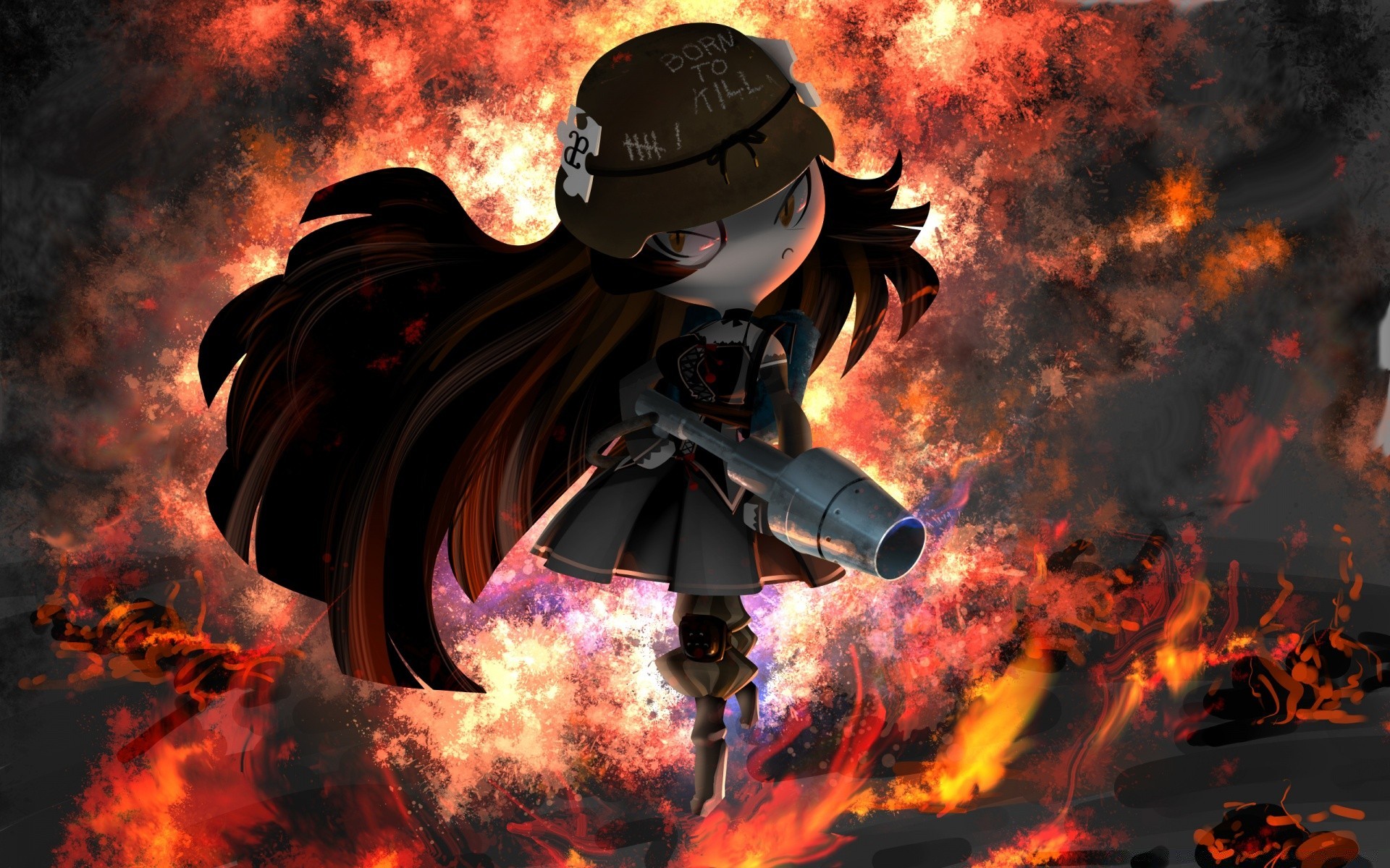 Una ragazza con un cappello con un'arma esce dal fuoco