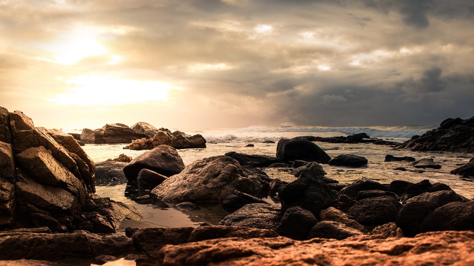 Grandi pietre sulla riva su uno sfondo di cielo coperto