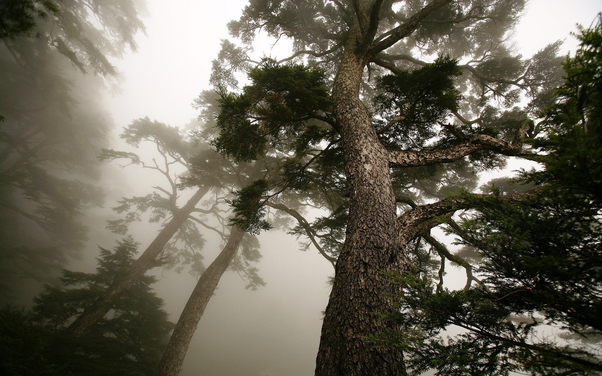 Alberi ad alto fusto in forte nebbia