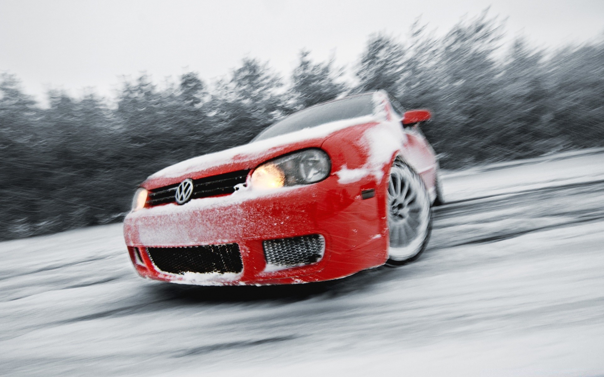 Foto dell'automobile di Volkswagen sulla strada nevosa nella deriva