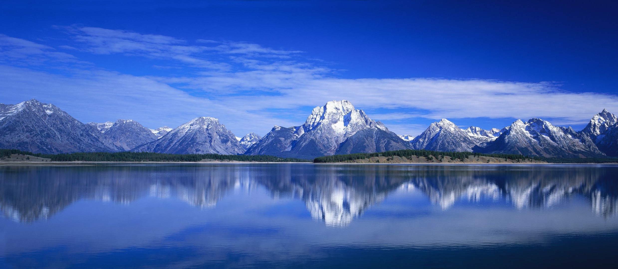 Il cielo blu brillante si riflette nella superficie del lago tra la foresta