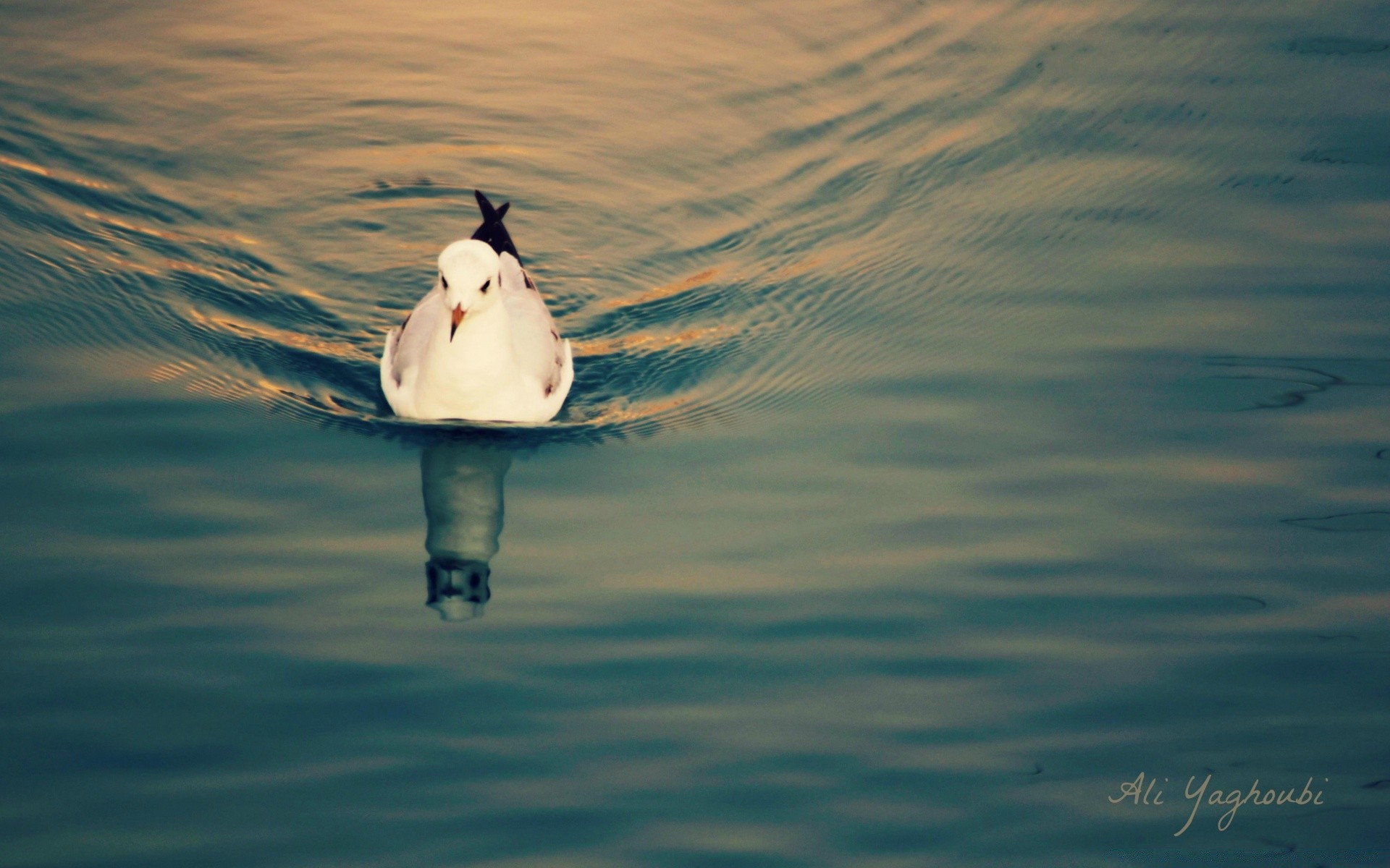 Gabbiano al tramonto in cerca di cibo nell'oceano