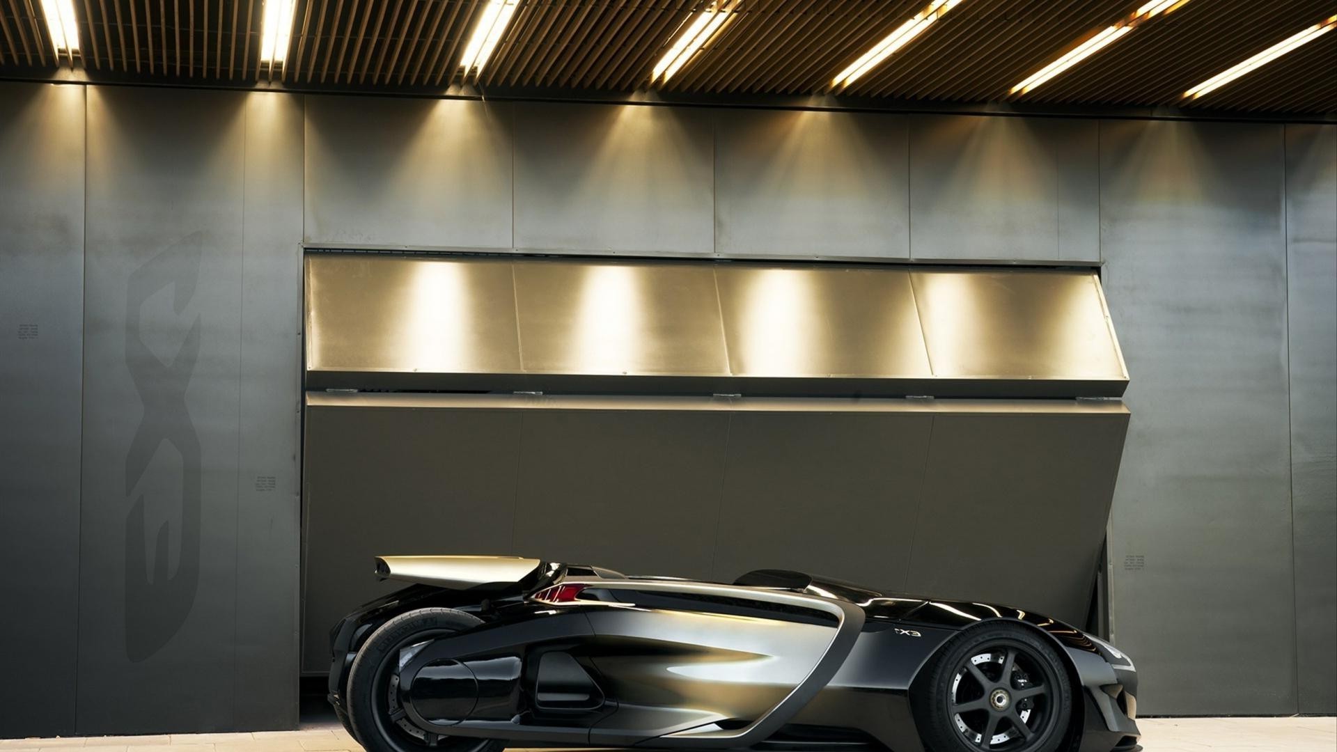 L'auto sportiva nera all'interno del garage di fascia alta è consacrata con lampade