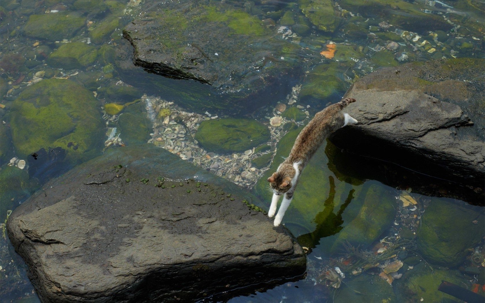 Gatto viaggiatore cammina sulle rocce sul fiume
