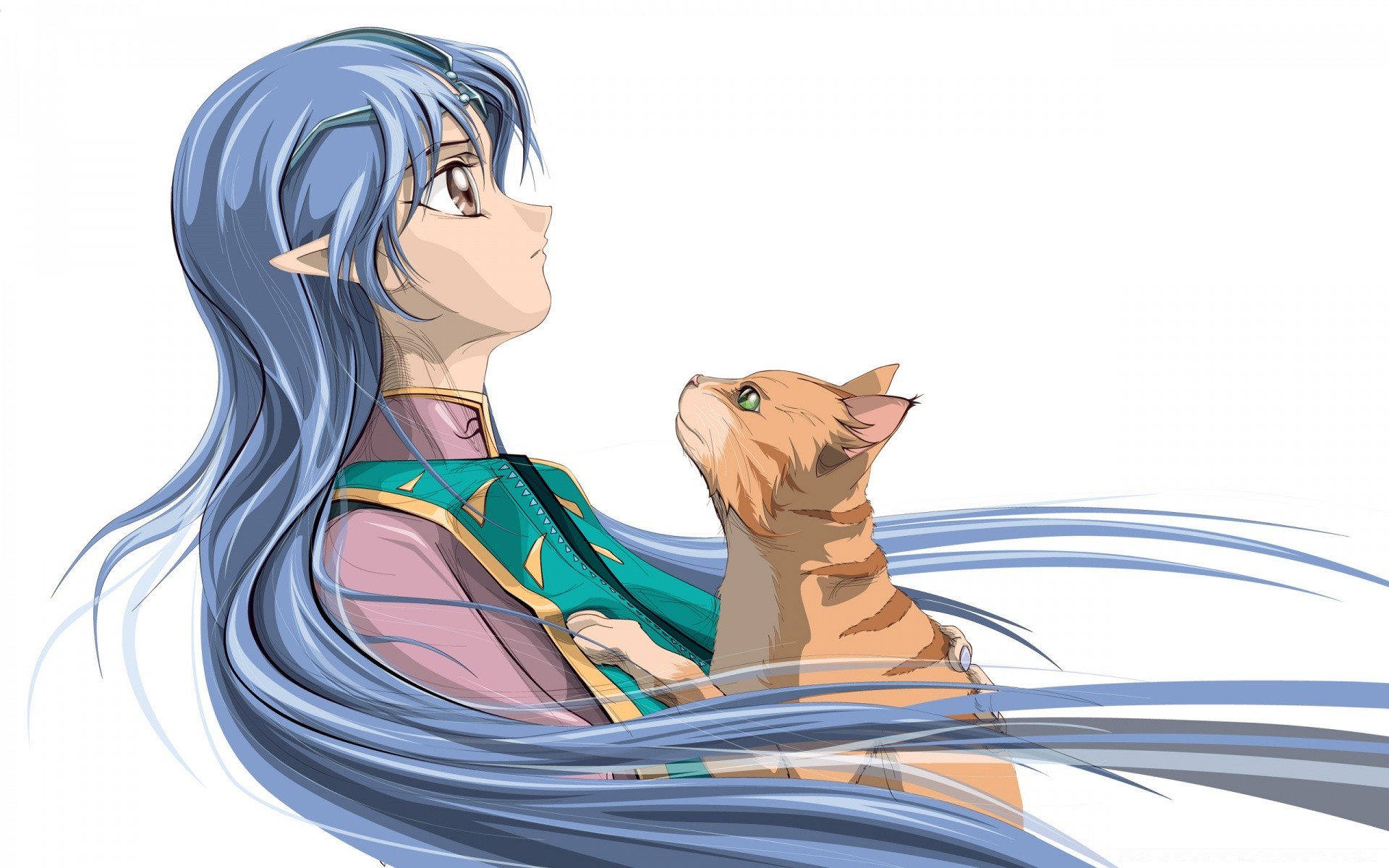 Una ragazza su un gatto vola una città su un arcobaleno