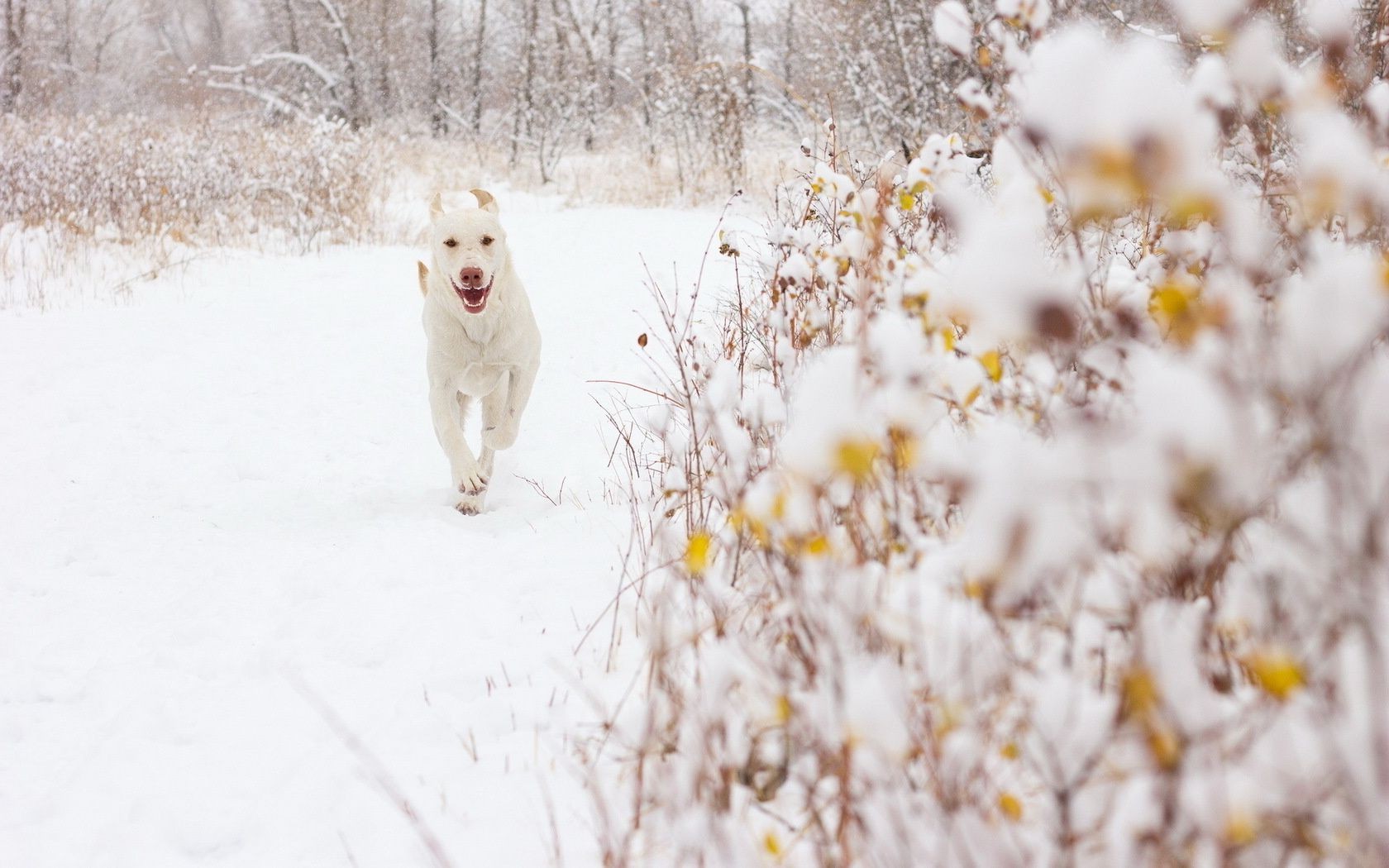 Grande cane bianco che corre attraverso la foresta innevataGrande cane bianco che corre attraverso la foresta innevata