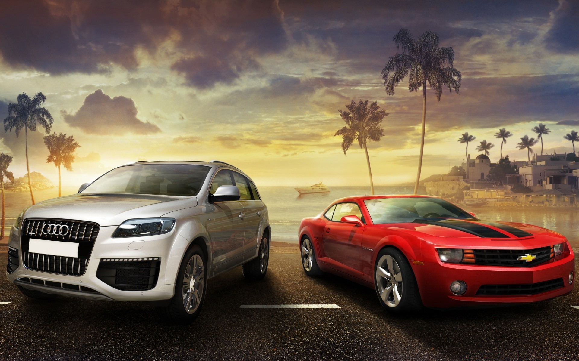Auto in piedi sulla spiaggia con le palme