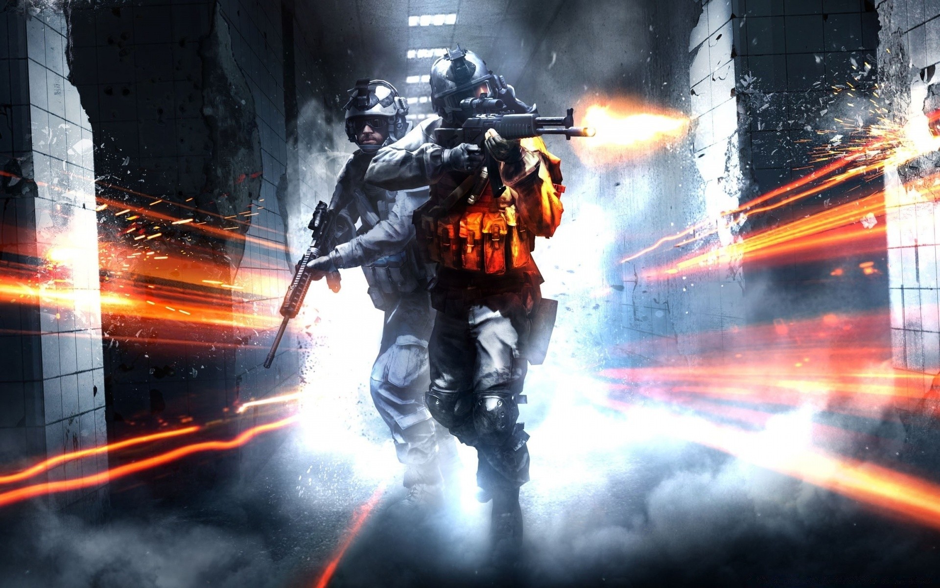 L'eroe del gioco Farcry 4 in pieno munizioni da combattimento si trova su un'alta riva del fiume fino alle ginocchia nell'erba sullo sfondo del cielo al tramonto