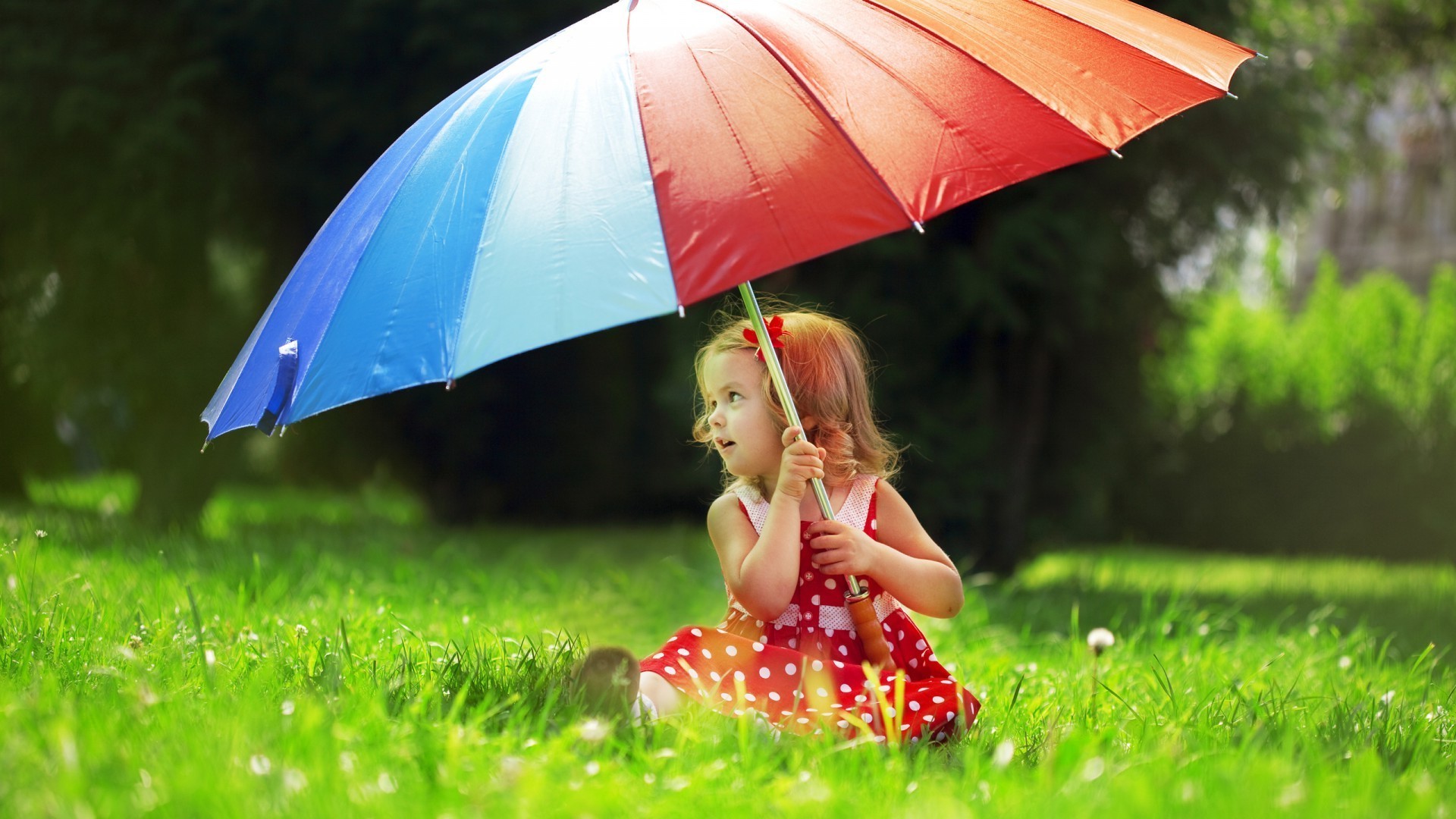 Ragazza in abito a pois seduta sull'erba sotto un enorme ombrello luminoso