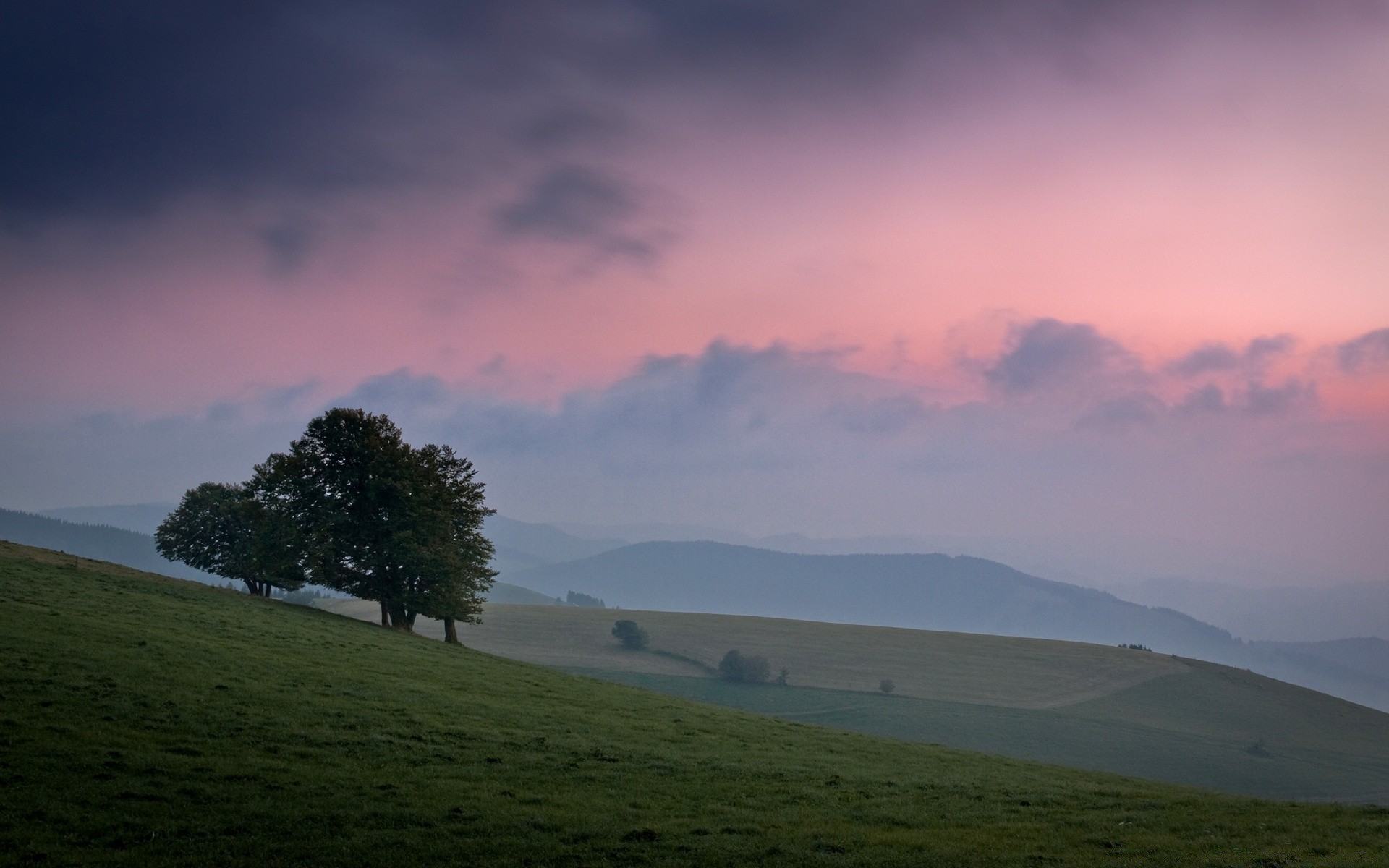 Alberi solitari su uno sfondo di cielo rosa-viola
