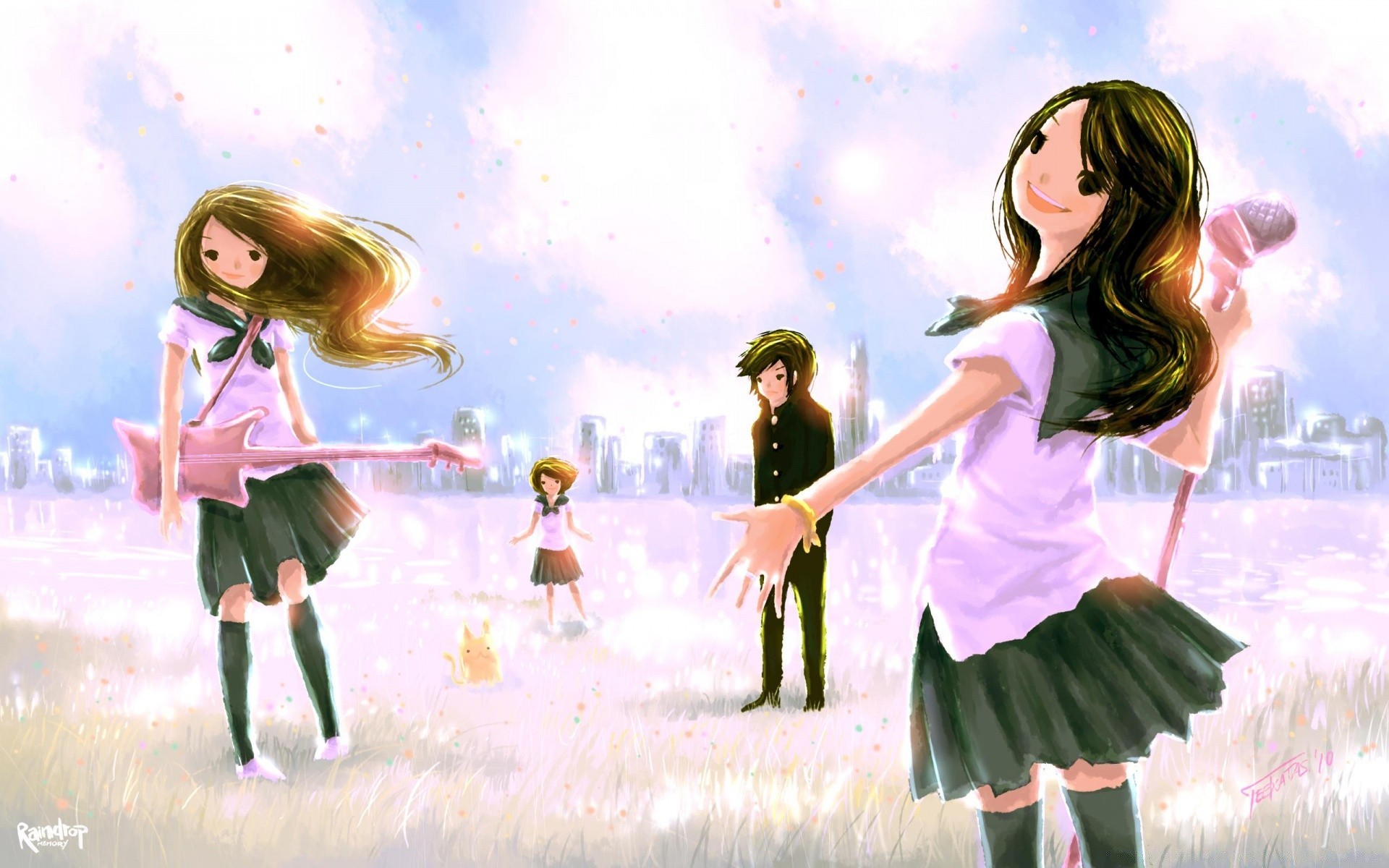 Gruppo musicale. Il giovane e le ragazze stanno provando. Anime