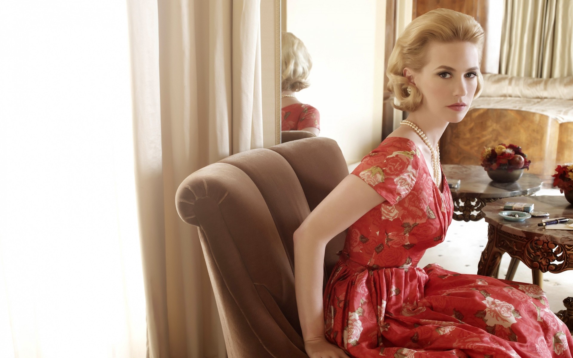 Donna adulta in abito rosso in camera si siede sulla mobilia