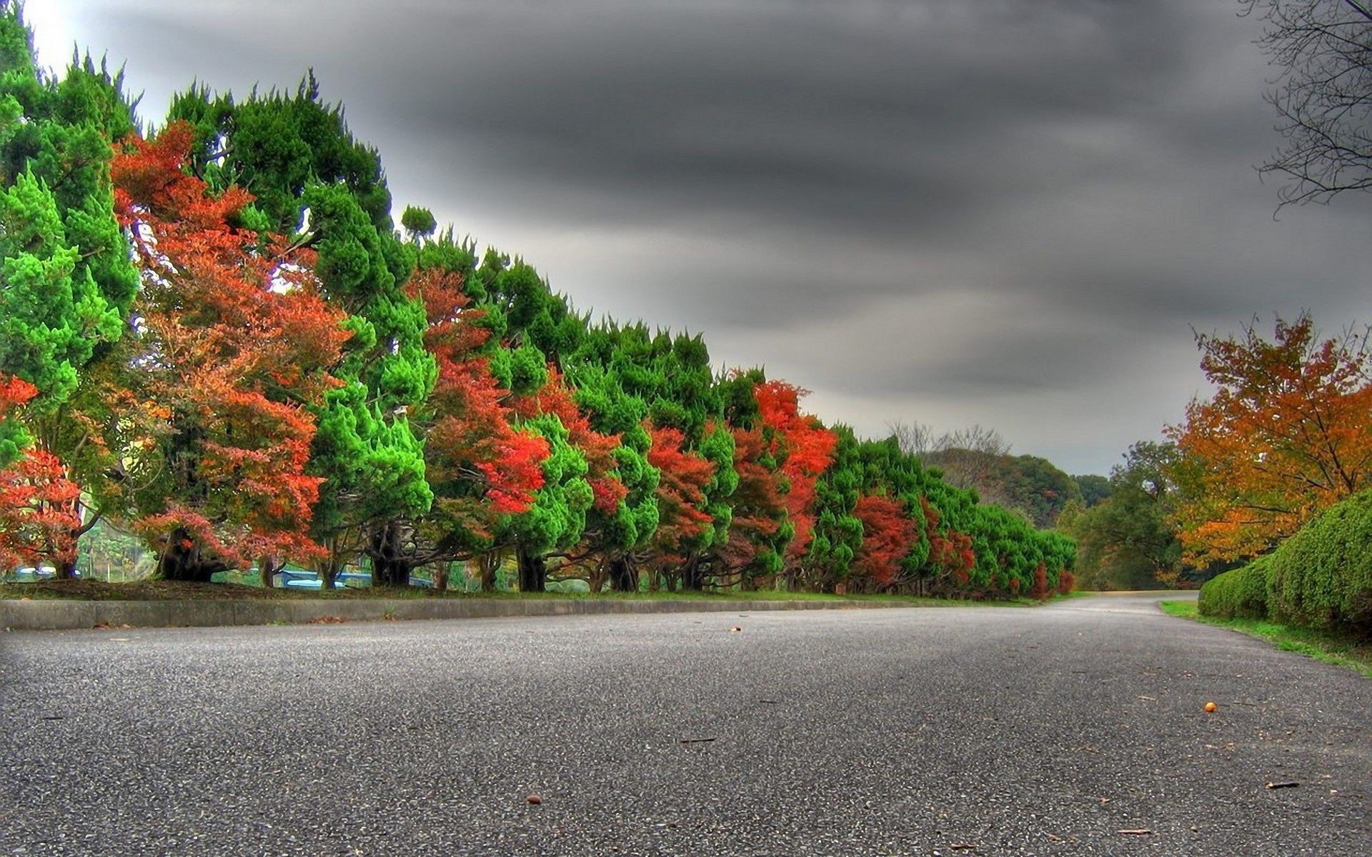 Vicolo degli alberi autunnali in attesa della pioggia dal cielo accigliato