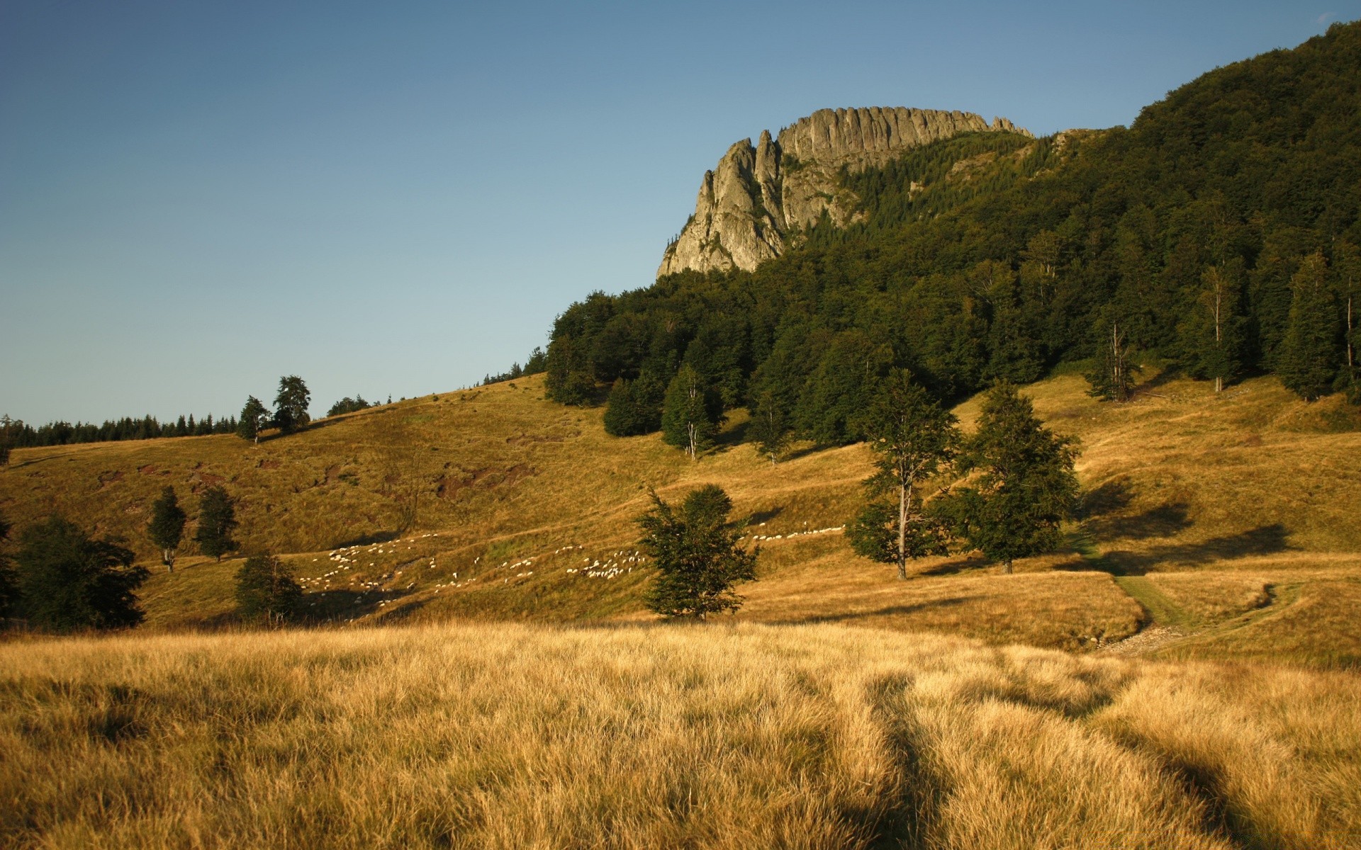 Prato autunnale e roccia circondata dalla foresta contro il cielo
