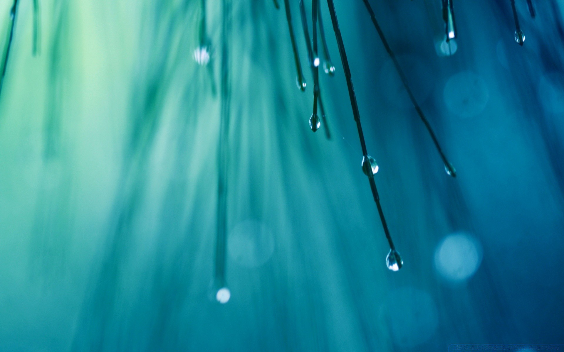 Gocce di pioggia che scorrono dalle piante su sfondo blu closeup
