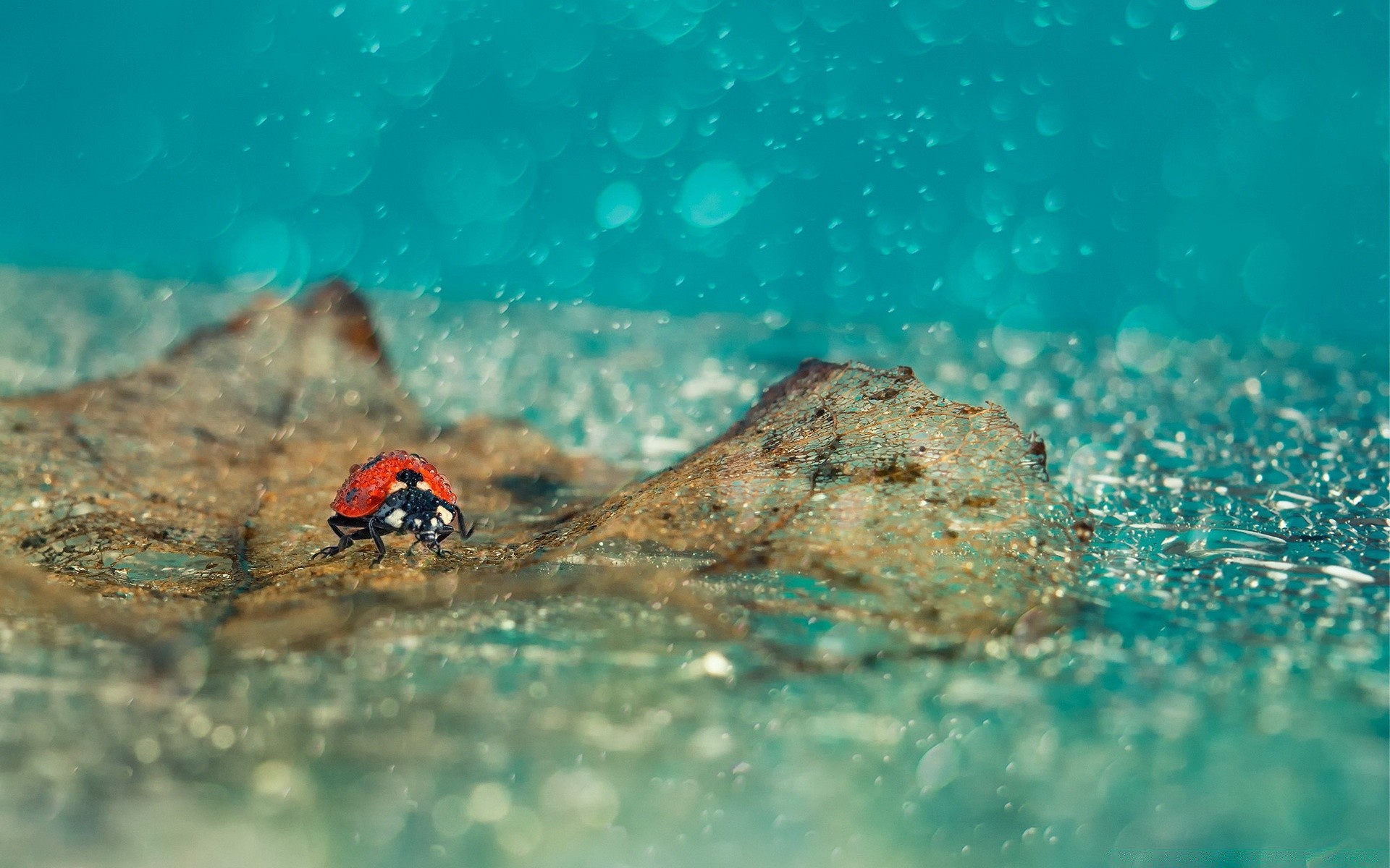 Coccinella galleggia su una foglia da un albero