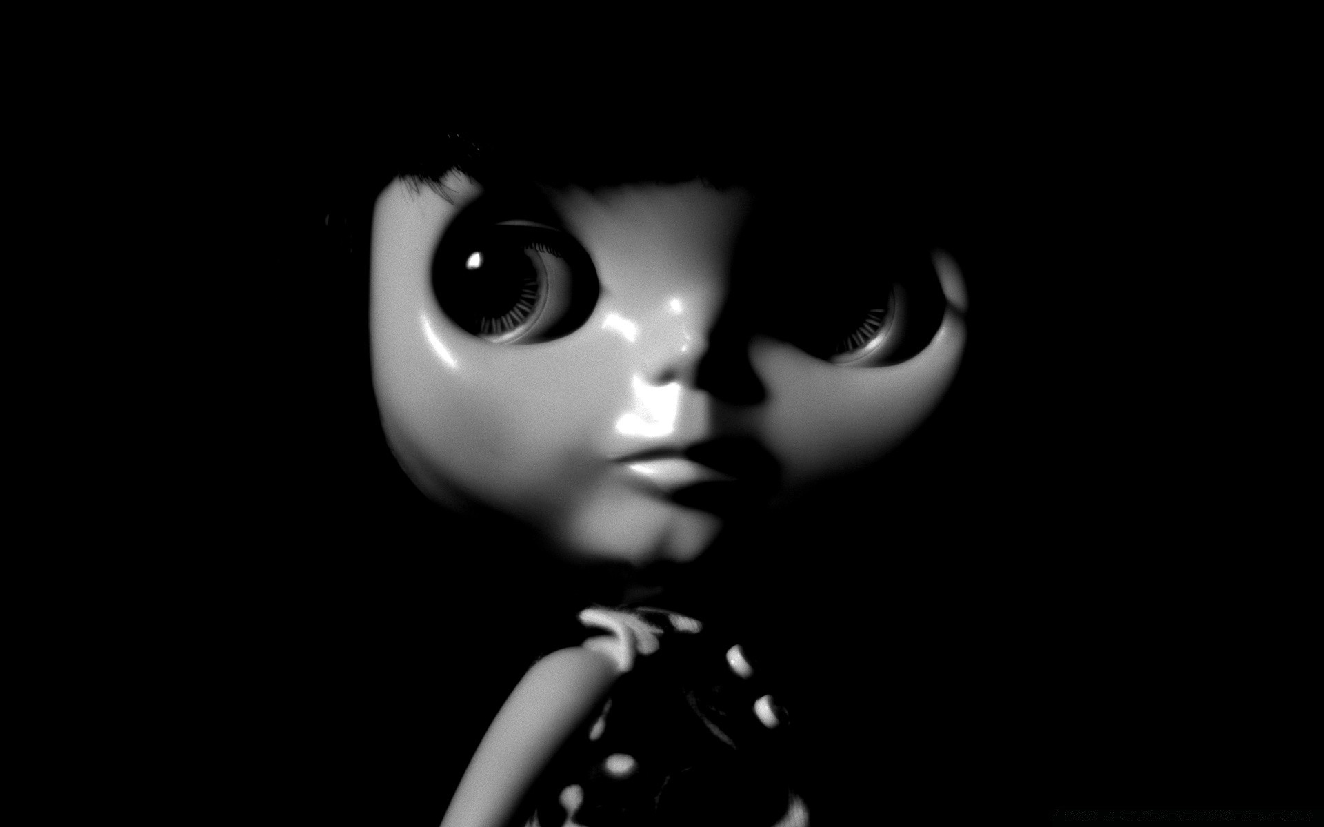 Ritratto in bianco e nero di una bambola nell'oscurità
