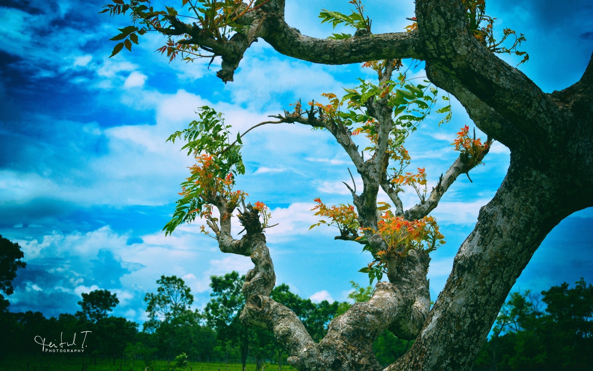 Rami di alberi in fiore su uno sfondo di cielo blu