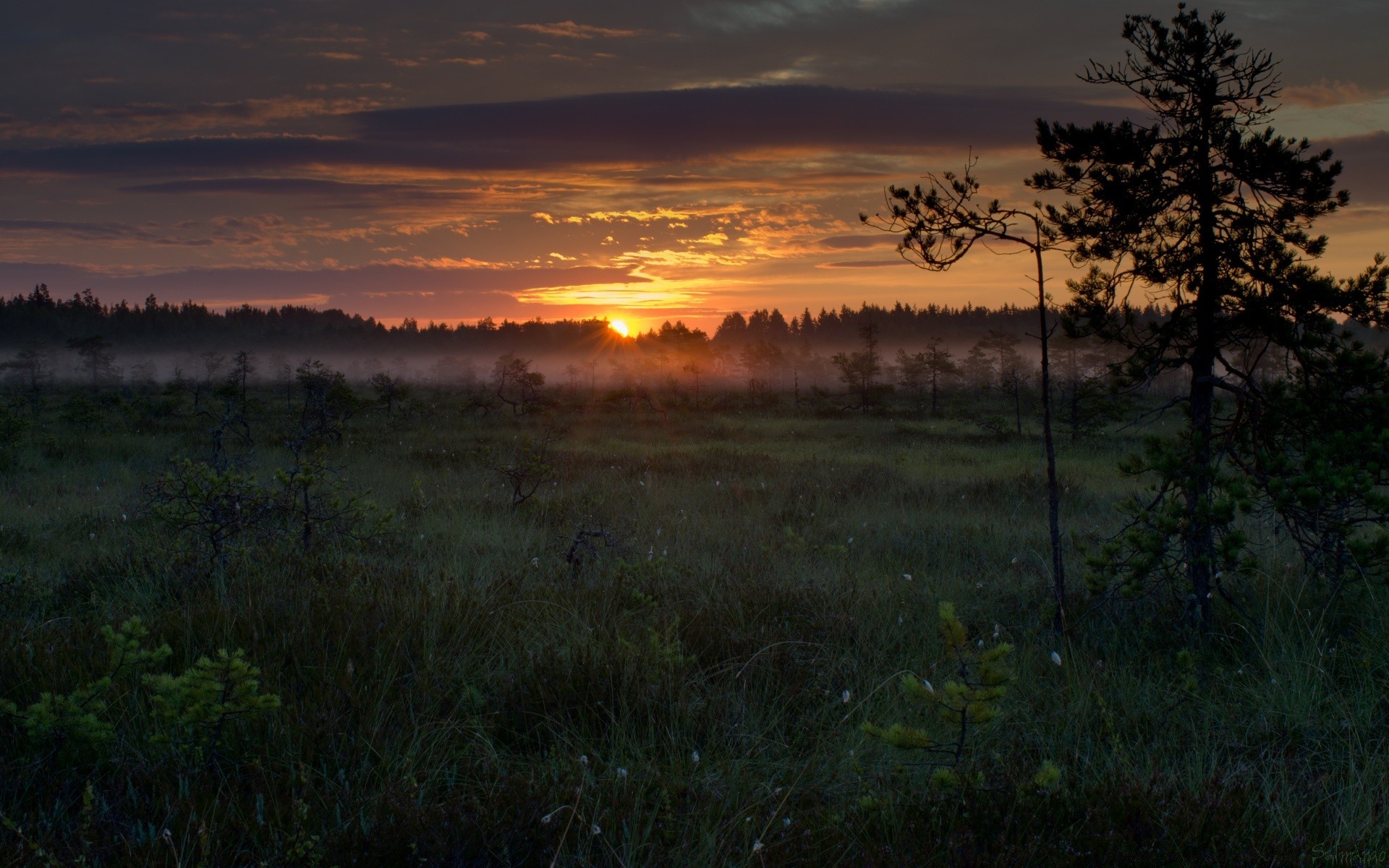 Incredibile tramonto in un campo nebbioso