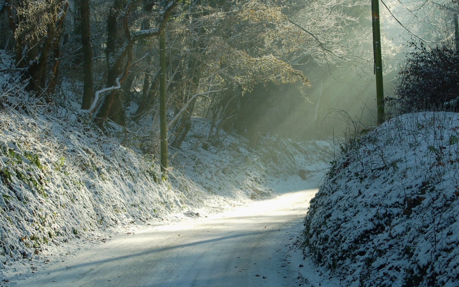 Raggi di sole su un sentiero boscoso in inverno