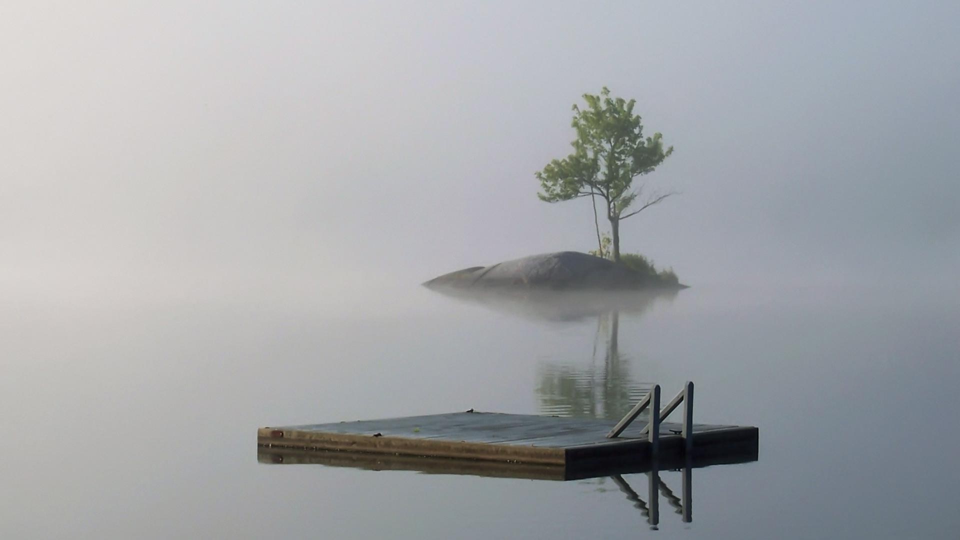 Isola solitaria nella nebbia con un albero