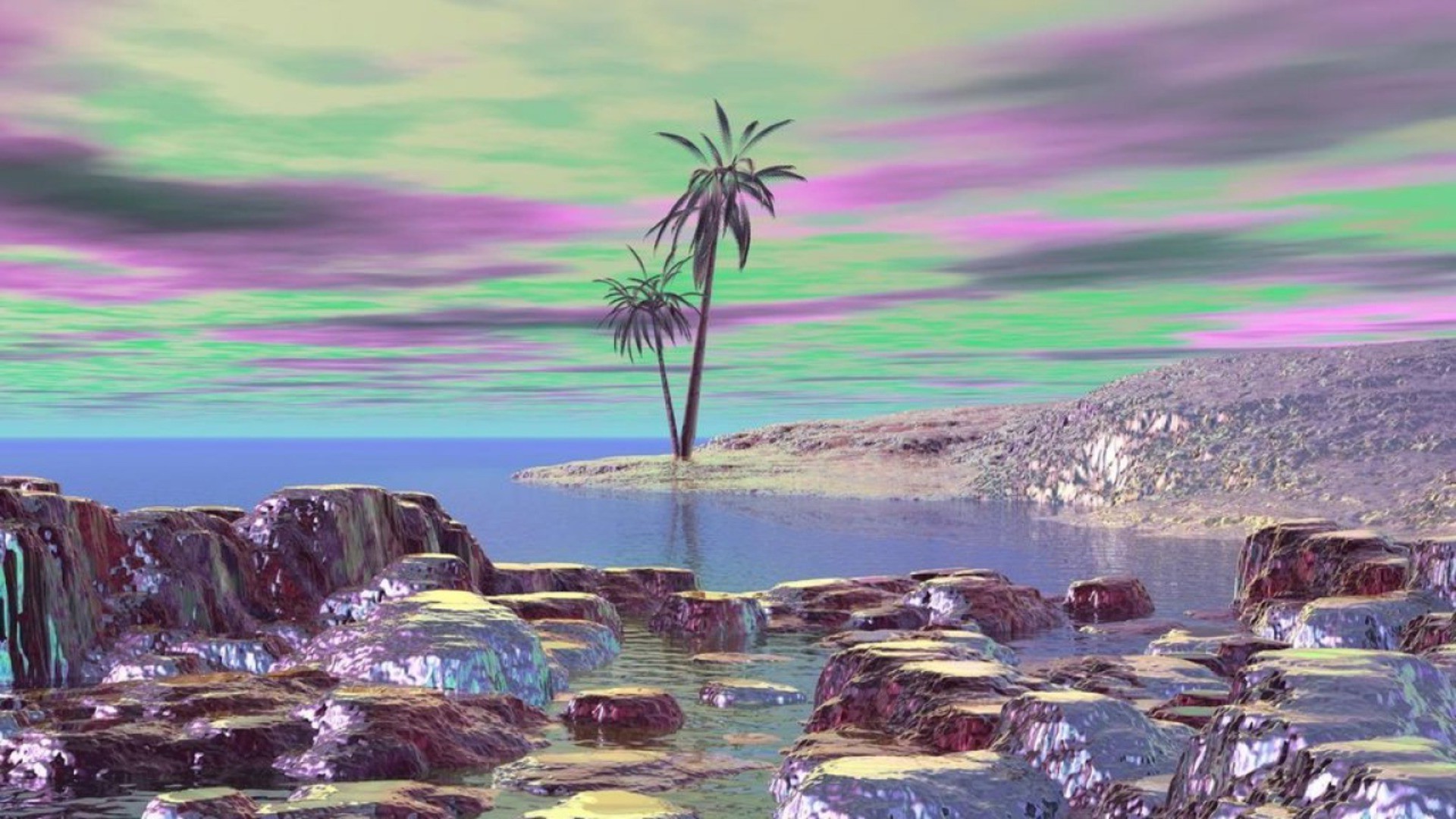 Impennata nel cielo notturno isola in foschia con albero, rocciaImpennata nel cielo notturno isola in foschia con albero, roccia