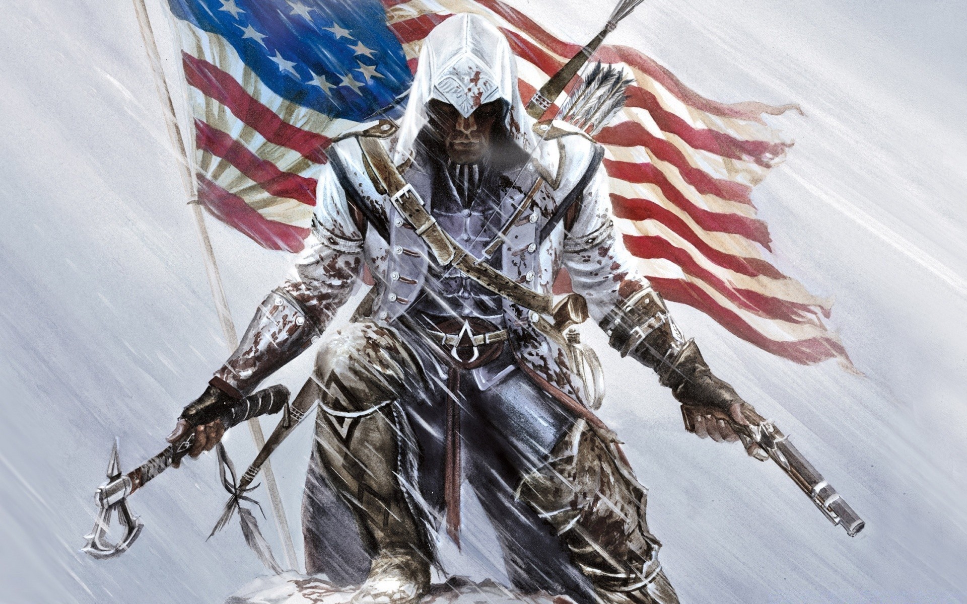 Guerriero con ascia e revolver sullo sfondo della bandiera americana del gioco assassin's creedGuerriero con ascia e revolver sullo sfondo della bandiera americana del gioco assassin's creed