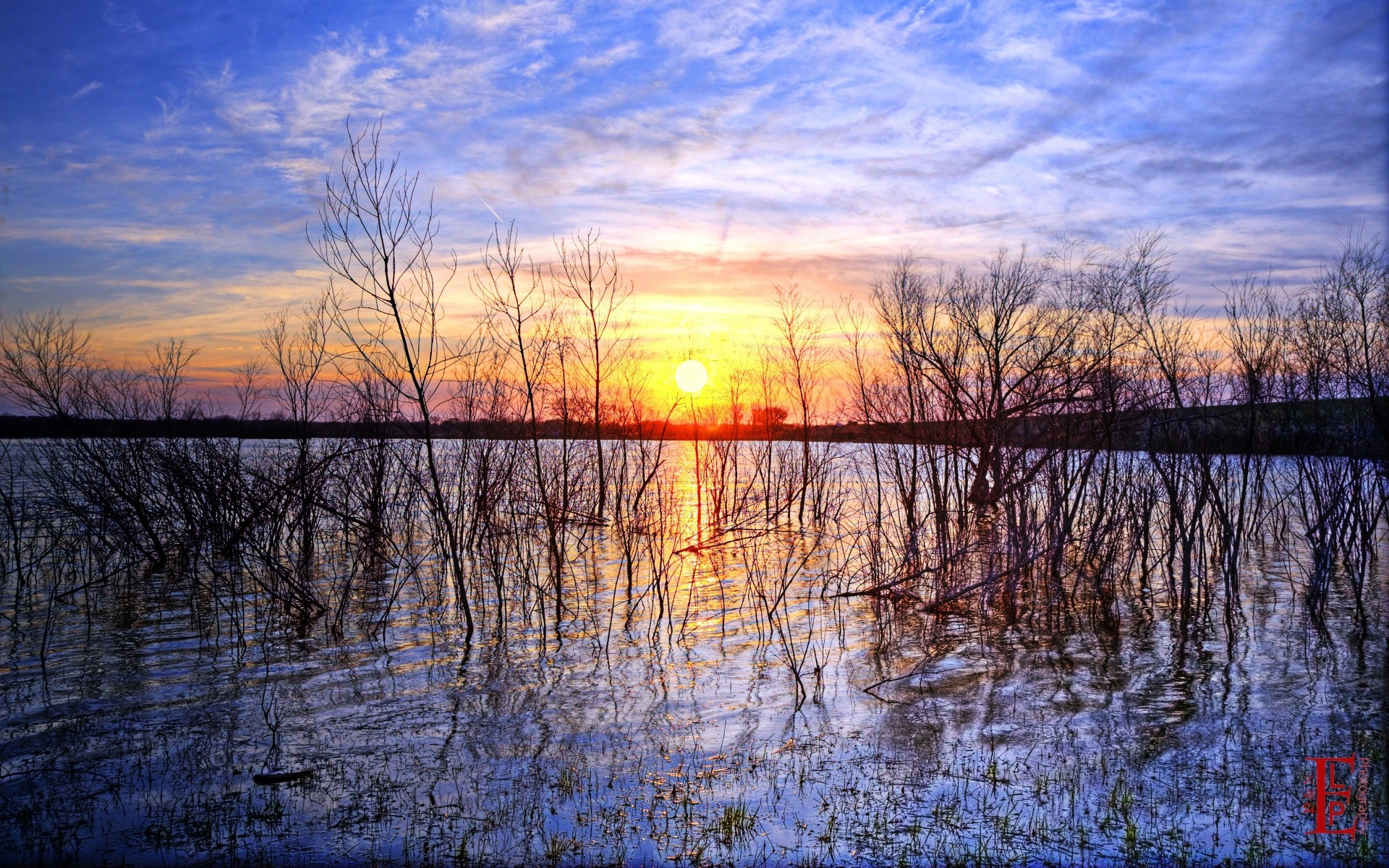 Un tramonto infuocato si riflette nella superficie dell'acqua del lagoUn tramonto infuocato si riflette nella superficie dell'acqua del Lago
