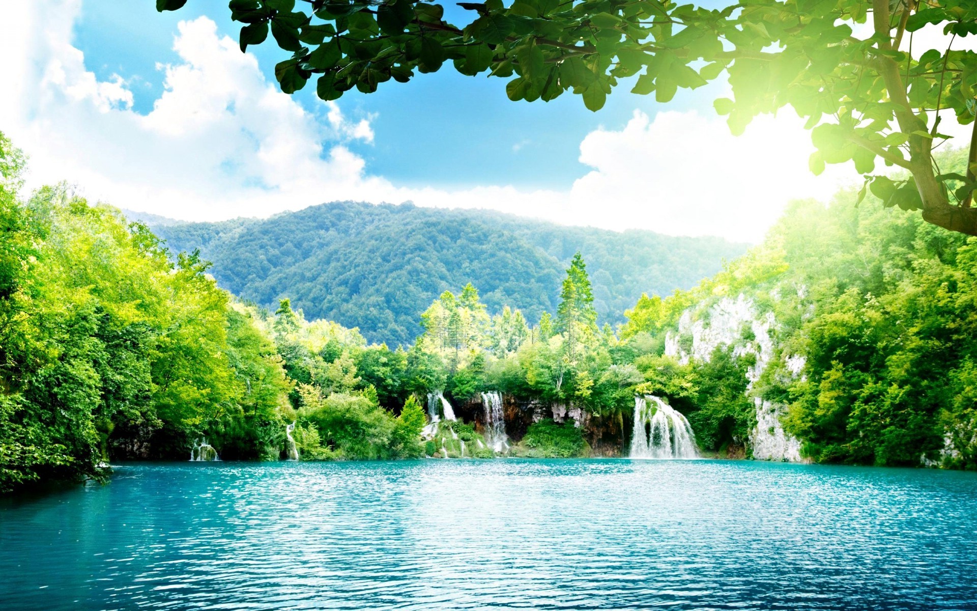 Il tramonto illumina la superficie del lago, la costa si riflette nell'acqua scuraIl tramonto illumina la superficie del lago, la costa si riflette nell'acqua scura